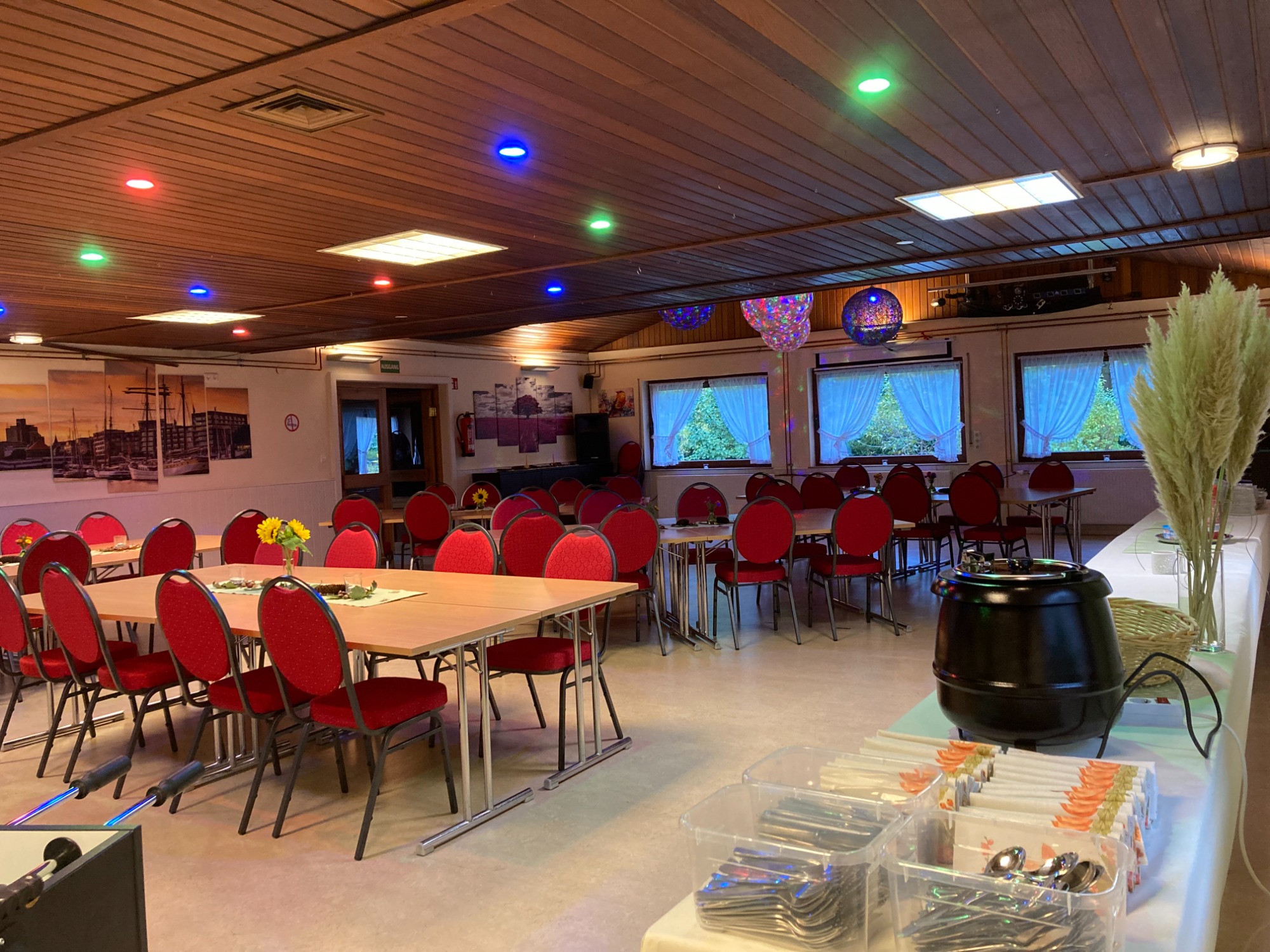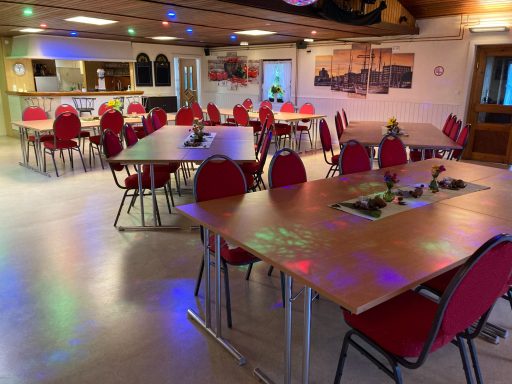 Neben einem Festsaal und einem Tresen mit Schankanlage, verfügt es außerdem über eine großzügige überdachte Terrasse und bietet Platz für bis zu 100 Gäste.